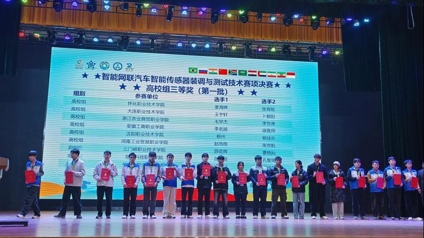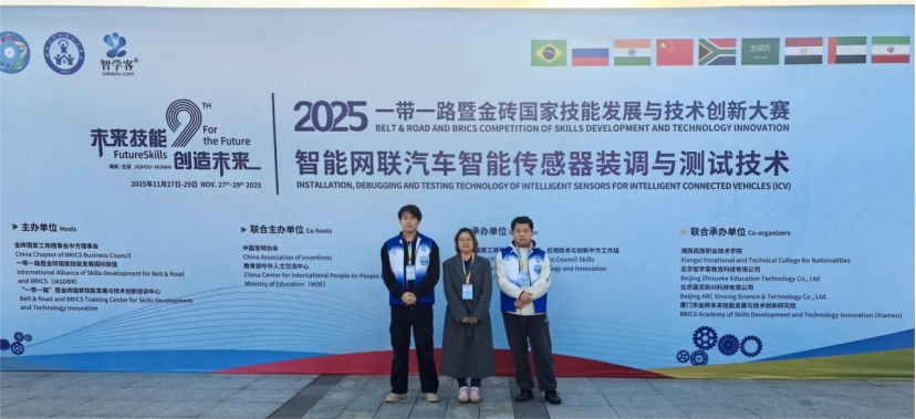 2025"一带一路"暨金砖国家技能发展与技术创新大赛之“智能网联汽车智能传感器装调与测试技术”赛项决赛于2025年11月26-29日在湖南湘西民族职业技术学院成功举办,汽车学院尹金楷、金银平两位老师指导的24级智能网联汽车技术专业学生薛庭辉、曹晓灿,凭借扎实的技能功底与出色的现场表现,从全国众多参赛队伍中脱颖而出,荣获高职组铜牌,为我院新能源汽车技术专业群中智能网联汽车技术专业再添荣誉,助力高水平专业群的蓬勃发展。