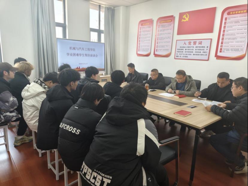 为加强学风建设,12月11日,机械与汽车工程学院召开学业提升帮扶座谈会,党总支书记雷旭锋,党总支副书记、学生工作负责人兀晓琦,教学科研负责人尹金楷,学工办负责人杨政威、教研办负责人田云飞,机电一体化教研室主任高宝东参加座谈会,会议由尹金楷主持。